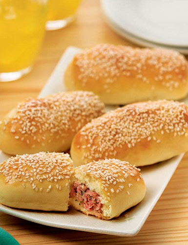 "Em uma superfície enfarinhada, abra a massa já crescida com o auxílio de um rolo. Corte em retângulos, distribua o recheio entre eles e enrole a massa em formato de bisnaga.Pincele com a gema e decore com o gergelim. Leve para assar em fôrma untada e enfarinhada em forno médio-alto (220ºC) por aproximadamente 50 minutos."